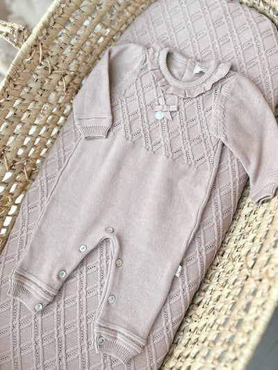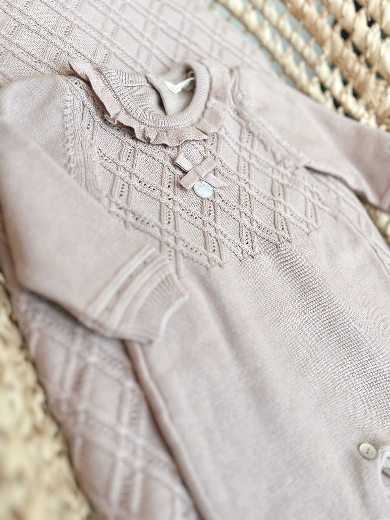 Je kunt niet genoeg boxpakjes hebben voor je kleine spruit. Maar dit prachtige boxpakje mag echt niet ontbreken in je baby uitzet en is een echte babymusthave. Het superschattige boxpakje is gebreid van 100% katoen en heeft een mooi kruislings patroon op de borst, een schattig strikje en een mooi ruffle kraagje. Het boxpakje heeft knoopjes langs de benen, zodat je je baby gemakkelijk kunt verschonen.