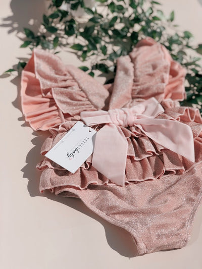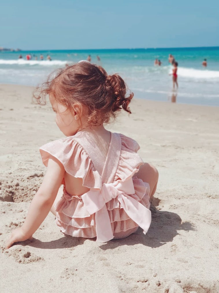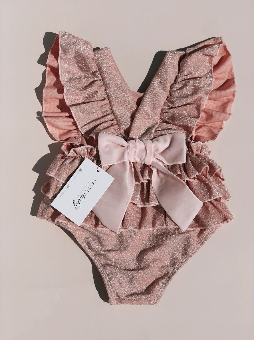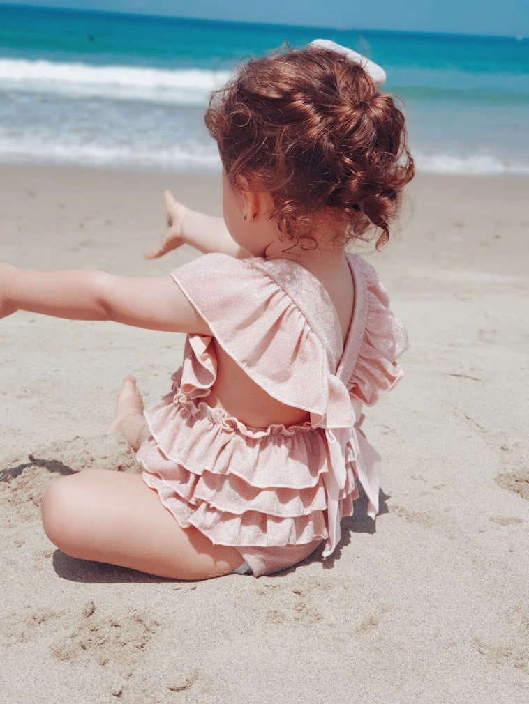 Een super schattige badpakje. Maar zal de enorm gaan jeuken, helaas! Dit omdat het glitterstofje best grof is. En ik uit ervaring praat, omdat ik ook een bikini heb in zo'n soort stof. En het irriteert mij al enorm na een uurtje dragen, laat staan een kleine baby :(