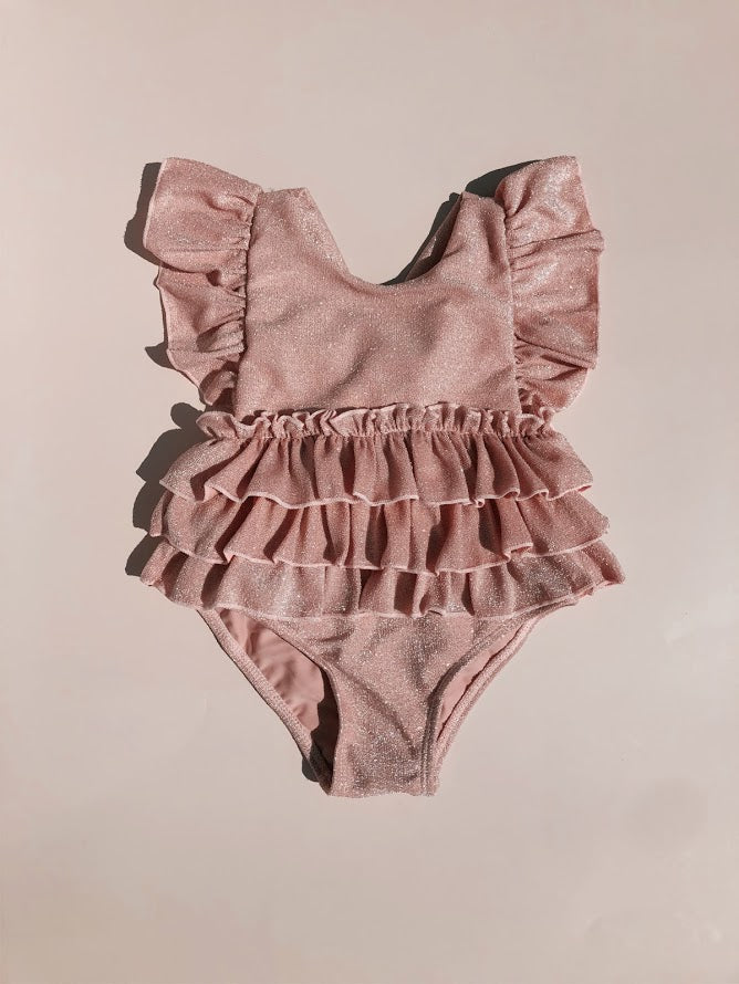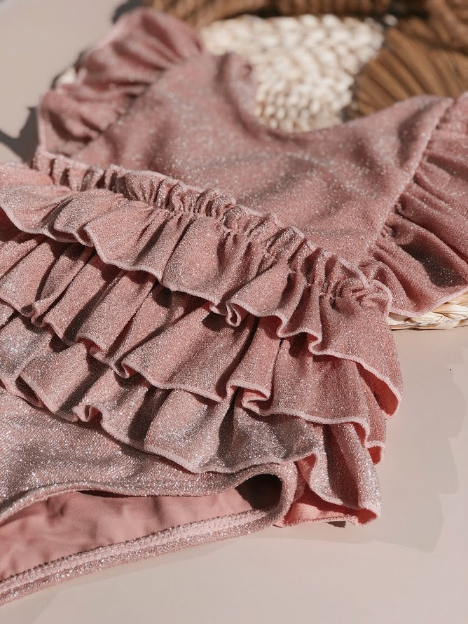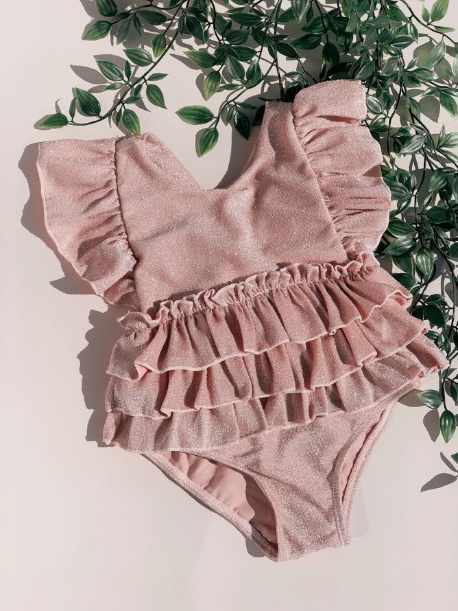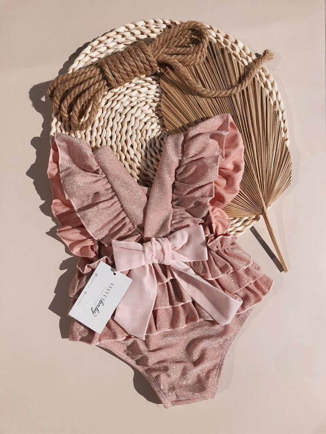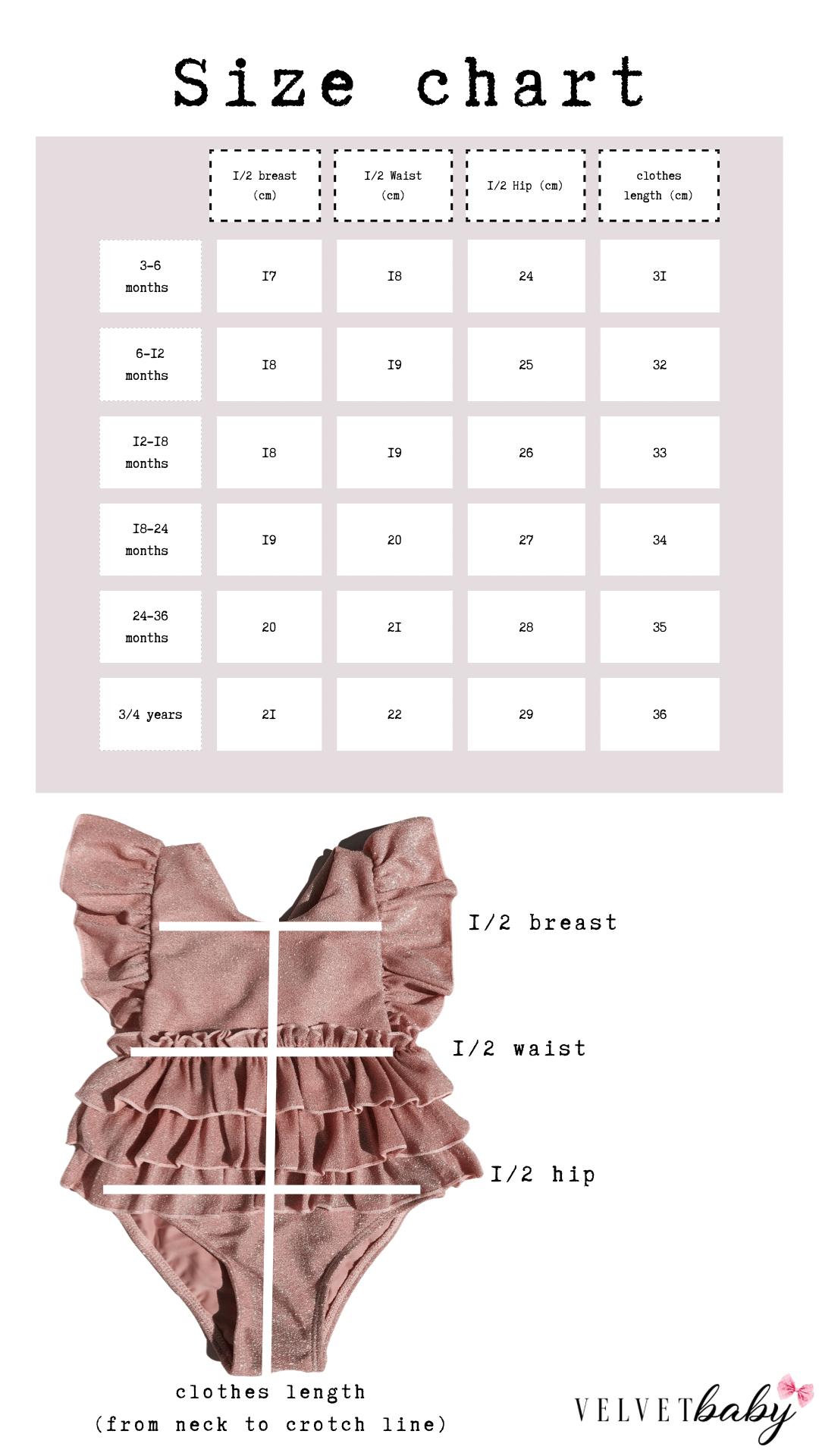 Een super schattige badpakje. Maar zal de enorm gaan jeuken, helaas! Dit omdat het glitterstofje best grof is. En ik uit ervaring praat, omdat ik ook een bikini heb in zo'n soort stof. En het irriteert mij al enorm na een uurtje dragen, laat staan een kleine baby :(