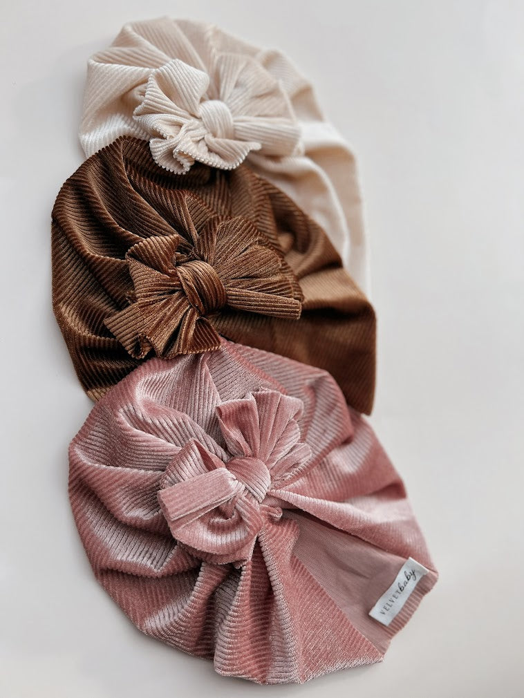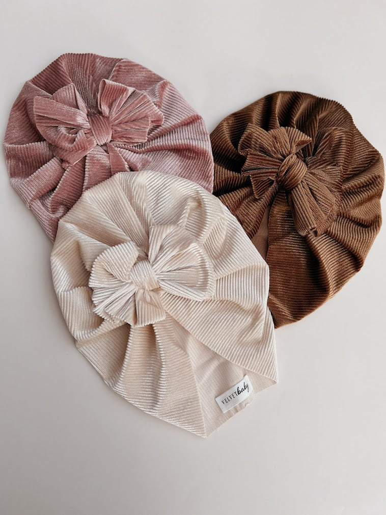 Baby turbans zijn zo'n enorme hit sinds een aantal jaar & wij begrijpen wel waarom. Ze hebben namelijk het "Aah, this is so cute" effect ♥! Deze mooie baby turban heeft alle trends: rib, velvet, turban, neutrale kleur & een schattig strikje.