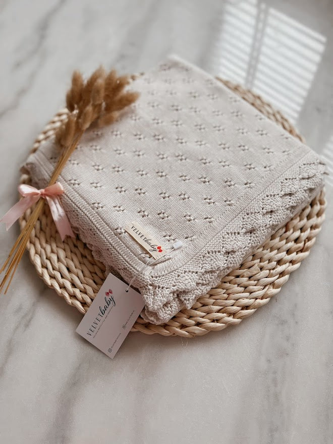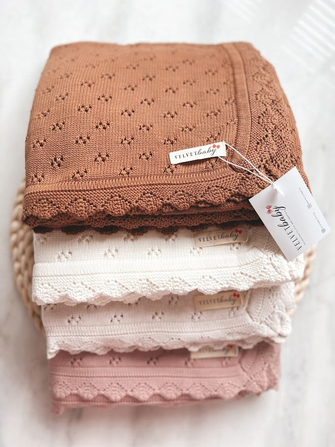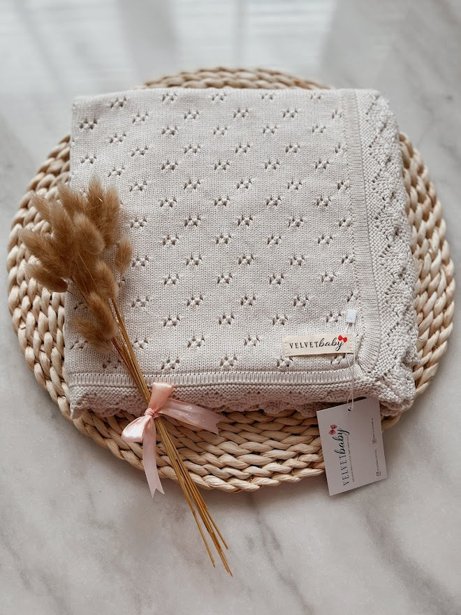 Dit mooie babydekentje heeft een klassieke look door het pointelle patroon en de mooie rand. Het babydekentje is gebreid van 100% katoen en voelen heerlijk zacht en comfortabel aan. Daarnaast is 100% katoen een ademende stof en anti-allergisch.